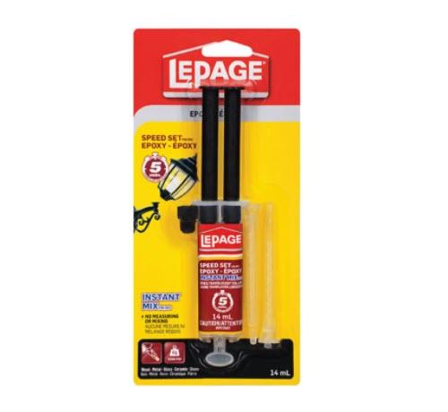 LePage Speed Set Instant Mix Epoxy is a two-part adhesive consisting of an epoxy resin and a hardener.