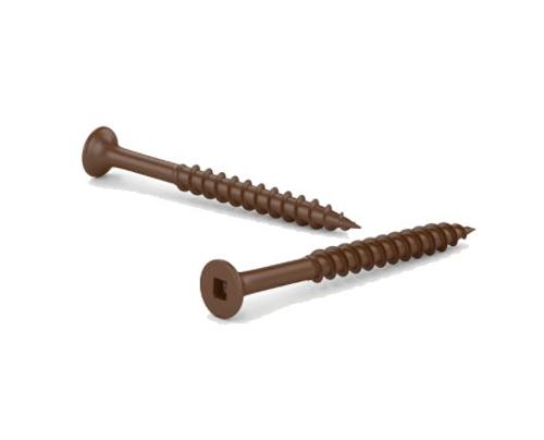 These screws are made for treated wood and are designed for use with a square-tip screwdriver. They are made in steel with an ACQ brown ceramic finish.